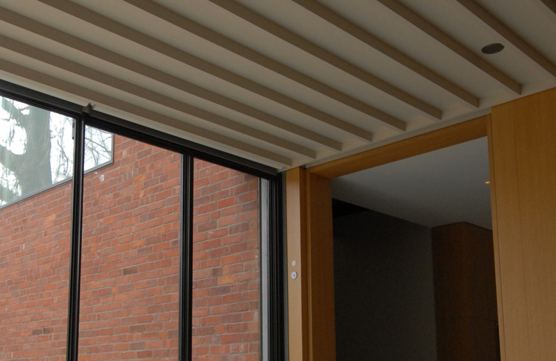 The relationship of the existing building, with its old brick walls that twist and turn, to its minimal, perfectly-rendered additions was a continual challenge to the designers, engineers, and, especially, the builders. The design aims to relate various building elements by aligning them and making them correspond across open space. Walls, floors, and ceilings come together with the most minimal joints, and they all contain concealed mechanical, electrical, and audio-visual systems. The result of these efforts is an, elegant, composed, and quiet space—a retreat from the busy city outside.
