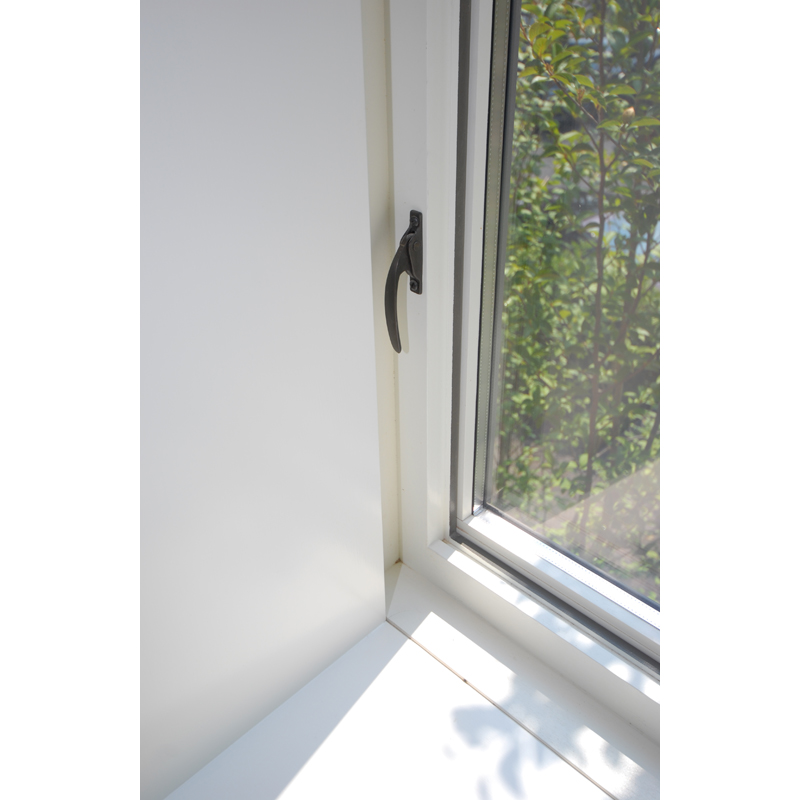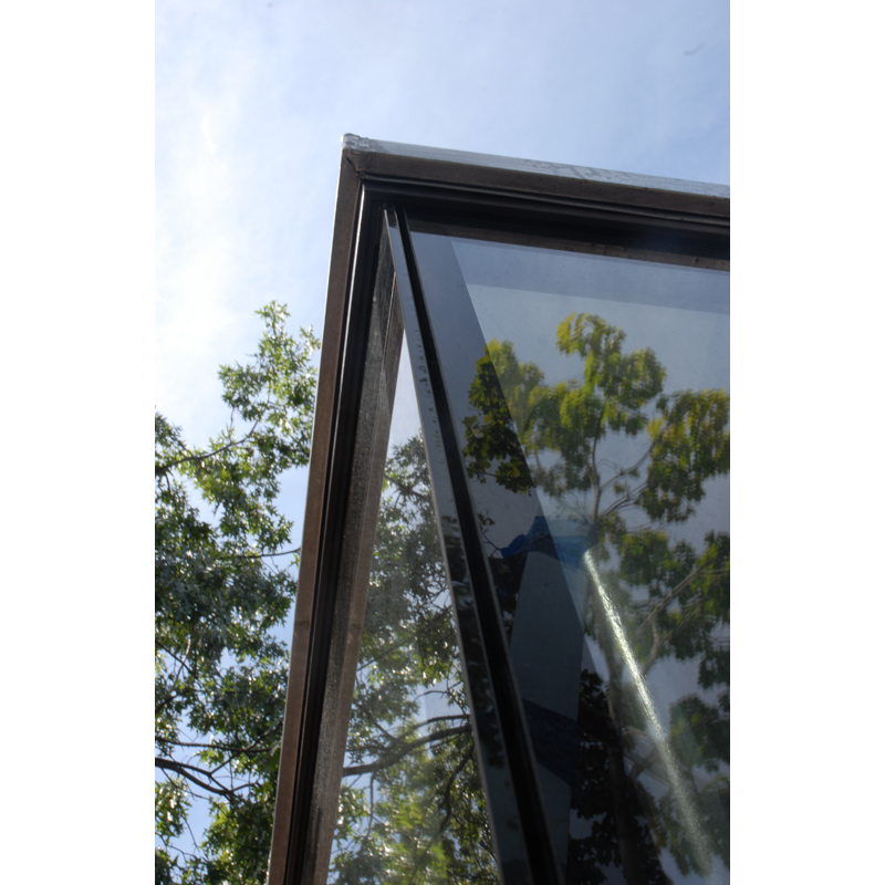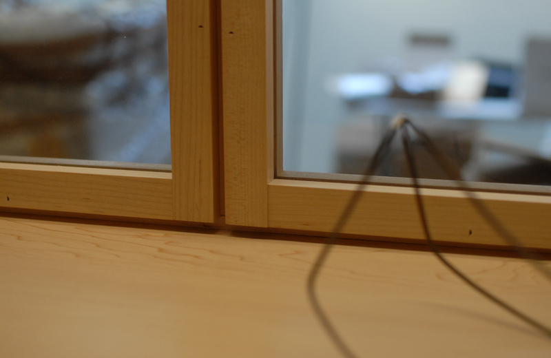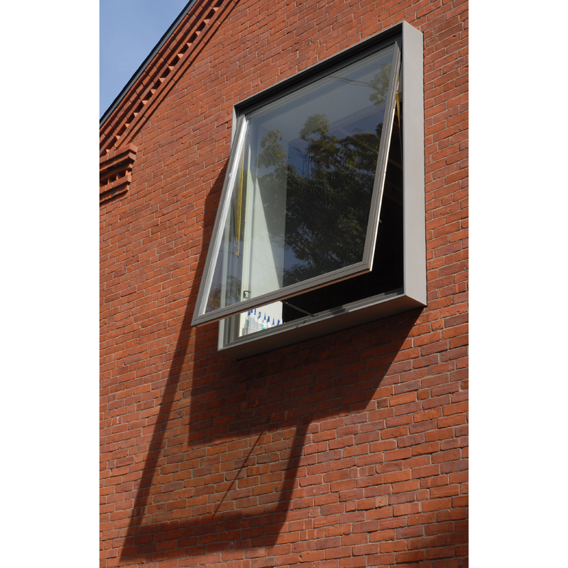 On the street façade, we replaced the existing doors and windows with high-performing replicas, but on the alley façade, which was previously blank, we punched large square openings and inserted frames of half-inch aluminum. Inside the frames are custom-built wood awning windows. On the window below, which sits outside of the building, we pushed the sash frame behind the interior walls, making it appear like a simple square opening when viewed from inside. The edges of the window align with the walls and casework that surround it, giving the space a clear sense of order.