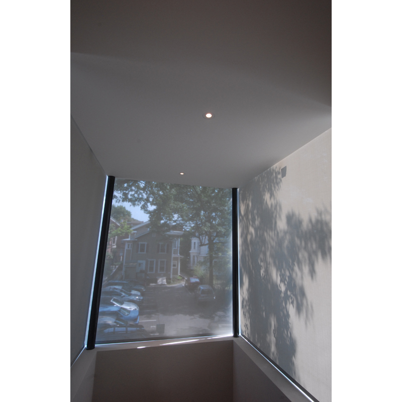 On the interior, the window sashes are pushed outside of the casings, concealing them from view, and leaving visible only glass